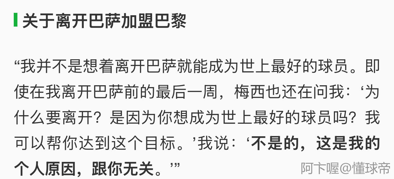 “我并不是想着离开巴萨就能成为世上最好的球员。即使在我离开巴萨前的最后一周,梅西也还在问我:‘为什么要离开?是因为你想成为世上最好的球员吗?我可以帮你达到这个目标。’我说:‘不是的,这是我的个人原因,跟你无关。’”