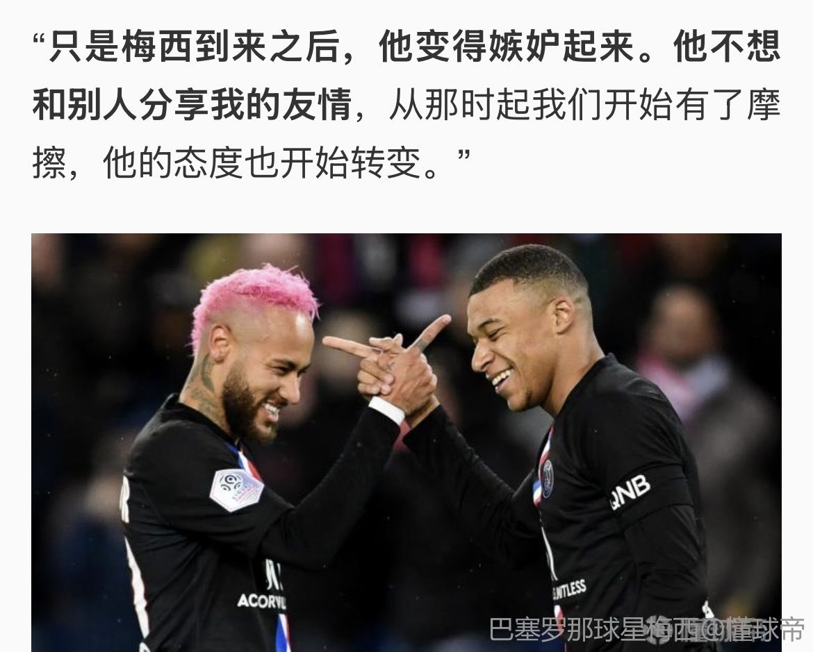 别瘠薄的挑拨离间了,姆和梅关系差吗?互喂球传球你看不到?谁嫉妒谁很显然,来巴黎想另立门户当大哥是真的,被姆巴佩比下去了也是真的,只能说戏太多了,一个字为了钱,这话很难说出口?