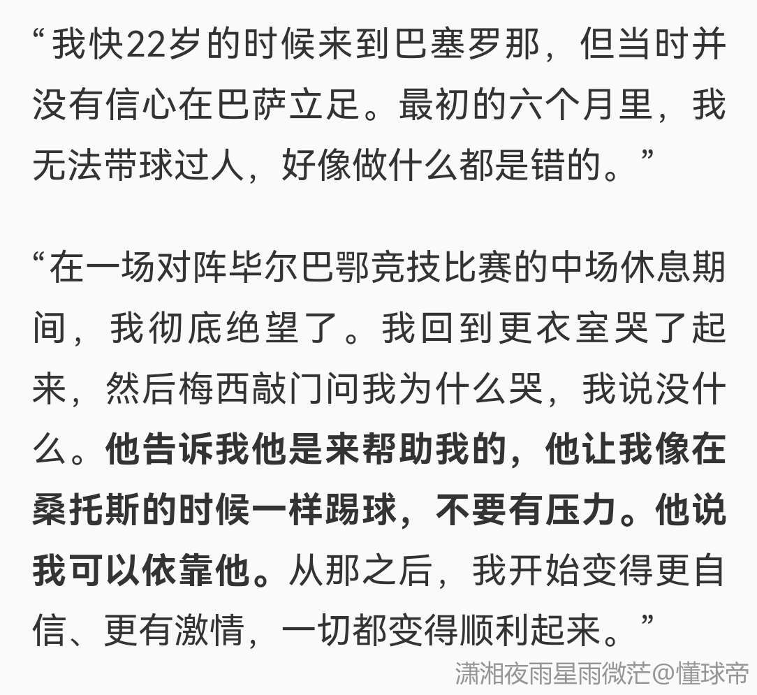 “在一场对阵毕尔巴鄂竞技比赛的中场休息期间,我彻底绝望了。我回到更衣室哭了起来,然后梅西敲门问我为什么哭,我说没什么。他告诉我他是来帮助我的,他让我像在桑托斯的时候一样踢球,不要有压力。他说我可以依靠他。从那之后,我开始变得更自信、更有激情,一切都变得顺利起来。”