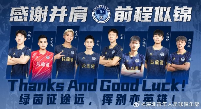 深圳青年人足球俱乐部感谢你们每一位球员在球队效力期间所付出的辛勤汗水和不懈努力,感谢你们为球队带来的荣耀和激情。你们即将开启新的征程,俱乐部希望你们未来无论走到哪里,都能继续发扬拼搏精神,取得更大的成就。同时,俱乐部也期待未来有机会与你们再次携手,共创辉煌!