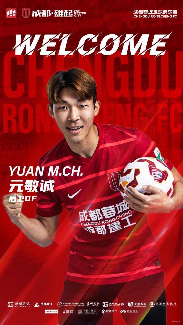 经与球员本人友好协商并达成一致,元敏诚正式加盟成都蓉城足球俱乐部。