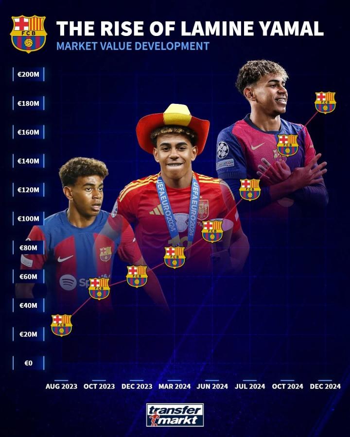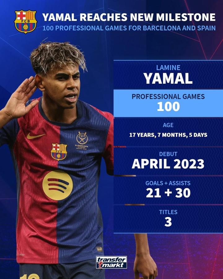 扫描下载懂球帝首页>动态> 亚马尔职业生涯已出战百场,斩获21球30助+三座冠军奖杯