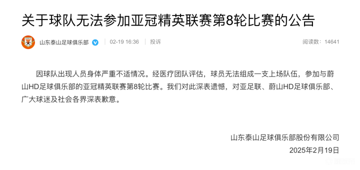 “因球队出现人员身体严重不适情况。经医疗团队评估,球员无法组成一支上场队伍,参加与蔚山HD足球俱乐部的亚冠精英联赛第8轮比赛。我们对此深表遗憾,对亚足联、蔚山HD足球俱乐部、广大球迷及社会各界深表歉意。