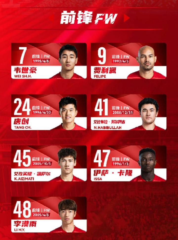 前锋:7-韦世豪、9-费利佩、24-唐创、41-艾比布拉-努尔阿吉、45-艾孜买提-凯萨尔、47-伊萨-卡隆、48-李漠雨