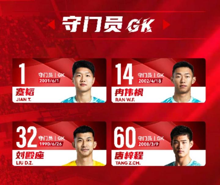 门将:1-蹇韬、14-冉伟枫、32-刘殿座、60-唐梓程
