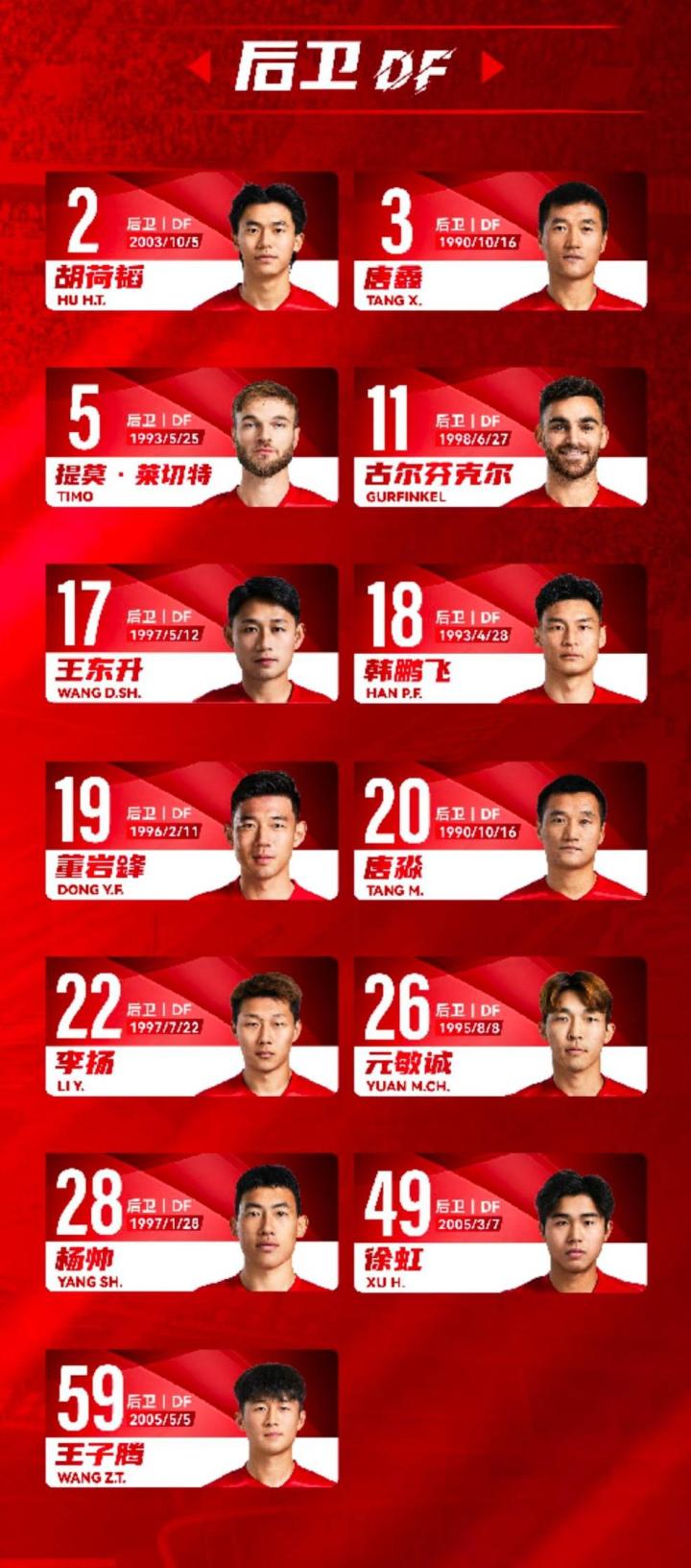 后卫:2-胡荷韬、3-唐鑫、5-提莫-莱切特、11-古尔芬克尔、17-王东升、18-韩鹏飞、19-董岩锋、20-唐淼、22-李扬、26-元敏诚、28-杨帅、49-徐虹、59-王子腾