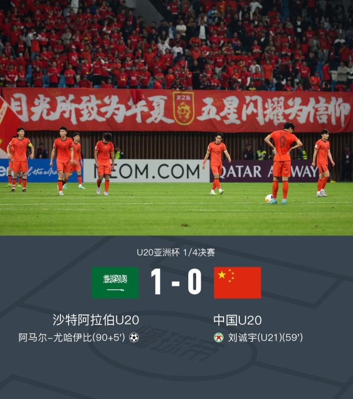 北京时间2月22日U20亚洲杯1/4决赛,中国U20对阵沙特阿拉伯U20。下半场,王钰栋造点,刘诚宇主罚点球罚丢,比赛读秒阶段,阿马尔-尤哈伊比破门。最终国青0-1不敌沙特阿拉伯U20,无缘晋级世青赛。