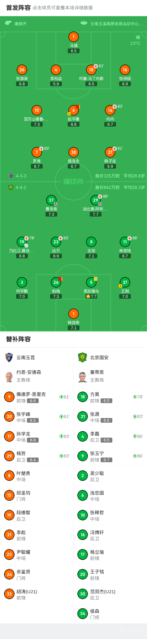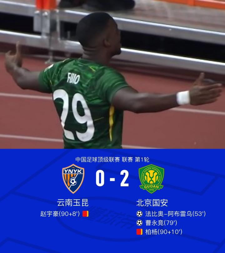 云南开场预支体能,后半程国安把握住了机会,法比奥状态上佳,恭喜开门红。