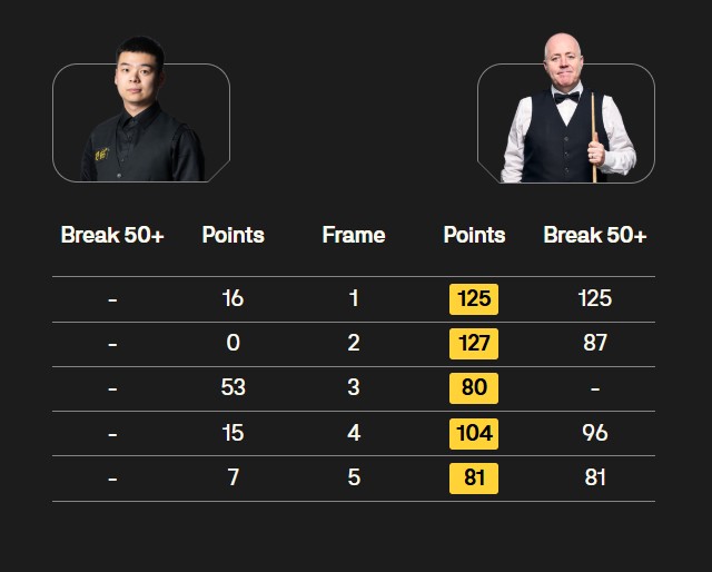 比赛中,希金斯状态火热,第一局打出单杆125分,随后又在第二局、第四局和第五局分别打出单杆87分、96分和81分,最终以5-0的大比分横扫庞俊旭晋级。
