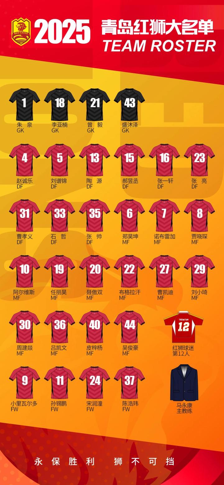 2025赛季青岛红狮一线队大名单