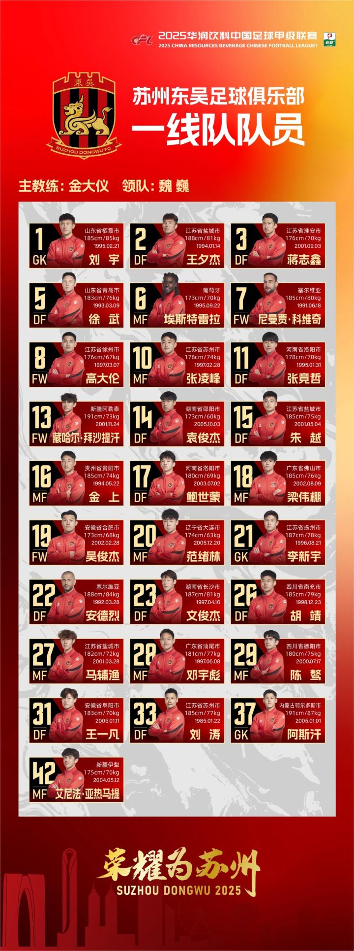 北京时间3月4日,苏州东吴公布新赛季一线队队员大名单,科维奇7号、埃斯特雷拉6号、安德烈22号。