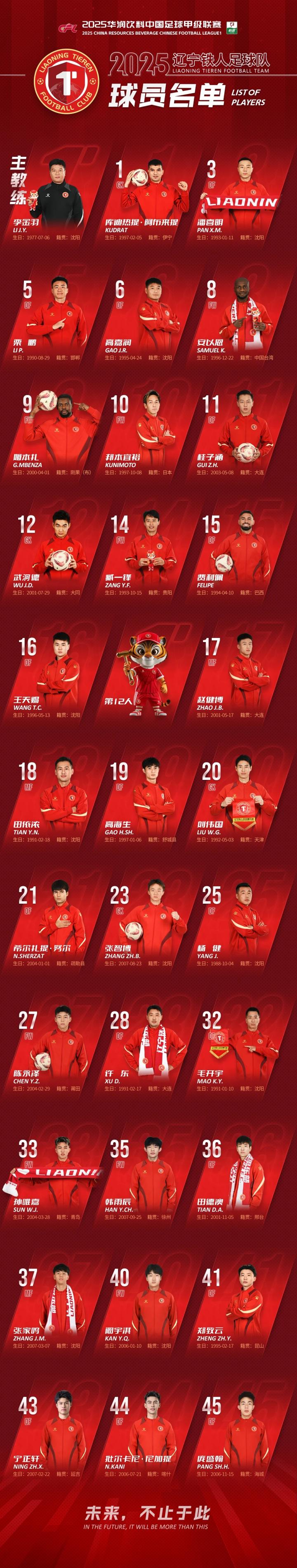 扫描下载懂球帝首页>动态> 辽宁铁人新赛季名单:伍小海、方爱东暂未在列,邦本宜裕10号