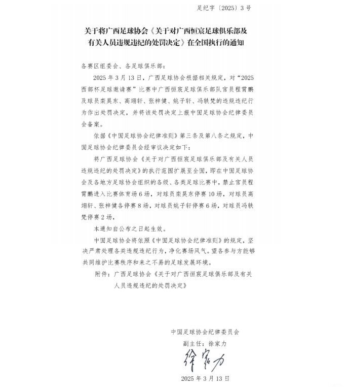 2025年3月13日,广西足球协会根据相关规定,对 “2025西部杯足球邀请赛” 比赛中广西恒宸足球俱乐部官员程霄鹏及球员栾昊东、高翊轩、张梓健、姚子轩、冯轶梵的违规违纪行为作出处罚决定,并将该处罚决定上报中国足球协会纪律委员会备案。
