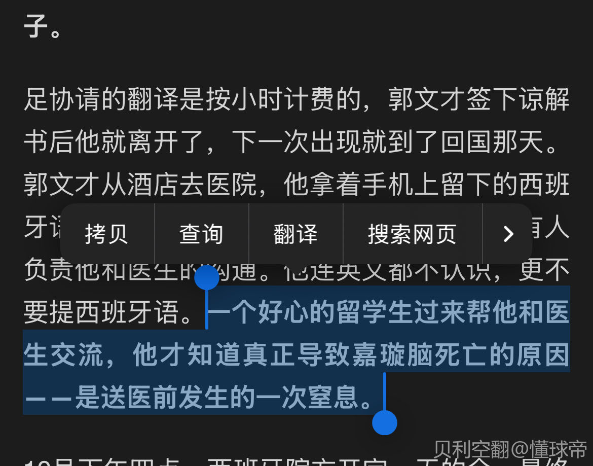 足协请的翻译是按小时计费的,郭文才签下谅解书后他就离开了,下一次出现就到了回国那天。郭文才从酒店去医院,他拿着手机上留下的西班牙语地址,指给司机看,足协的人不在,没有人负责他和医生的沟通。他连英文都不认识,更不要提西班牙语。一个好心的留学生过来帮他和医生交流,他才知道真正导致嘉璇脑死亡的原因——是送医前发生的一次窒息。