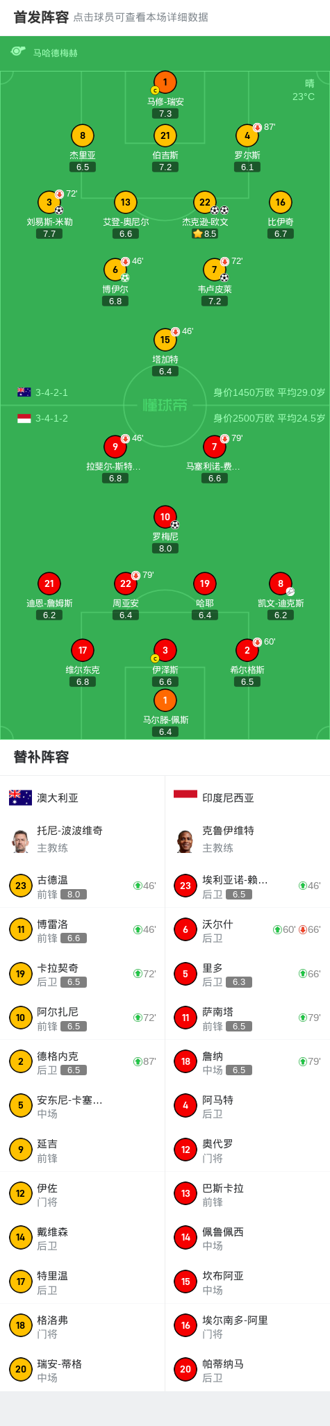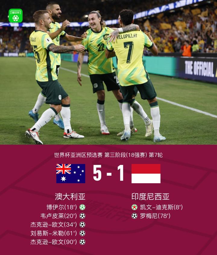 扫描下载懂球帝首页>动态> 澳大利亚5-1印尼,迪克斯开场失点,古德温两助攻,欧文双响