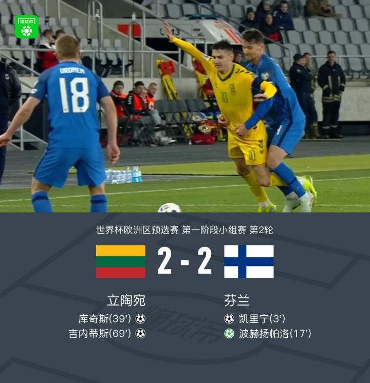 在世界杯欧洲区预选赛第一阶段小组赛第二轮的较量中,立陶宛与芬兰展开对决。比赛开始后,芬兰迅速占据主动,凯里宁为球队先拔头筹。随后,波赫扬帕洛通过点球机会扩大了领先优势。然而,立陶宛并未轻易放弃,库奇斯接到多尔日尼科夫的妙传后成功扳回一城。进入下半场,吉内蒂斯在戈卢比克卡斯的协助下再入一球,帮助立陶宛将比分扳平。最终,双方以2-2握手言和,各取一分。
