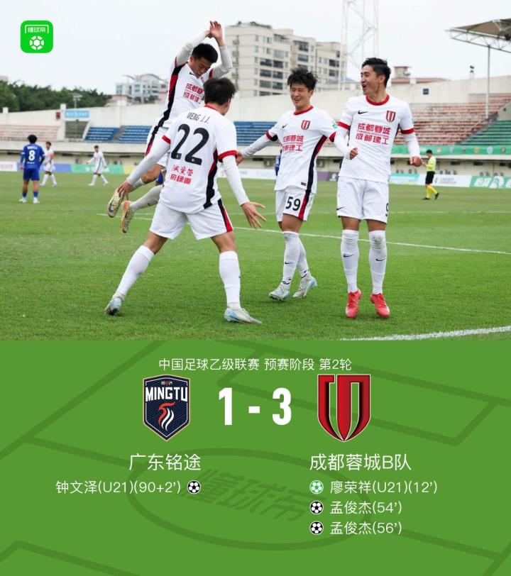 北京时间3月30日,中国足球乙级联赛预赛阶段第2轮,广东铭途主场迎战成都蓉城B队。比赛中,成都蓉城B队由廖荣祥罚入点球,随后孟俊杰连入两球为球队扩大优势。广东铭途在比赛尾声由钟文泽扳回一城。最终,广东铭途1-3不敌成都蓉城B队。