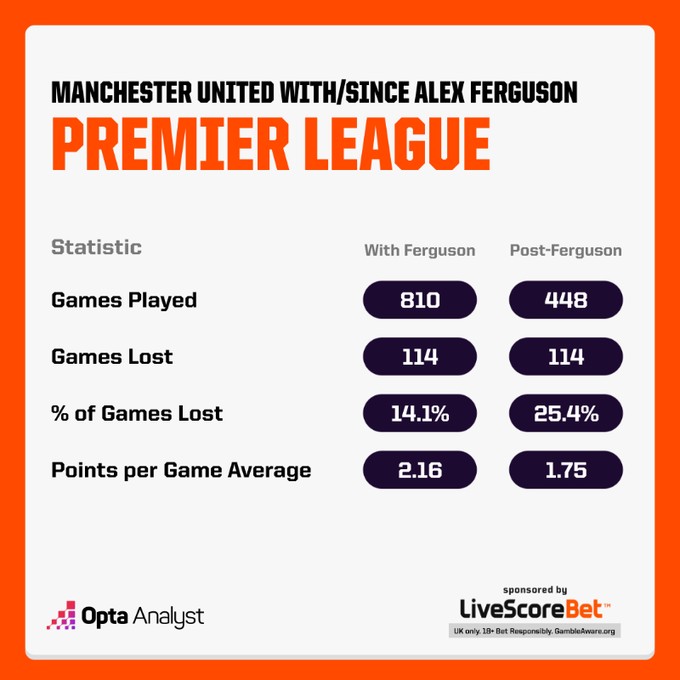 扫描下载懂球帝首页>动态> 若今晚失利,曼联后弗格森时代英超输球数将超过弗格森执教时