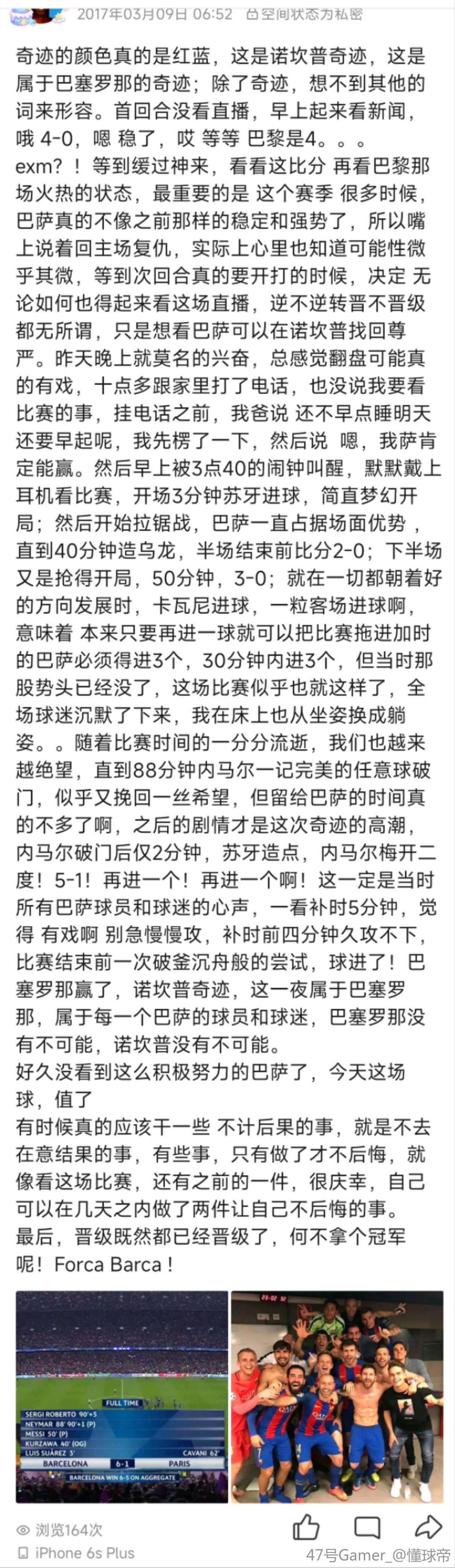 那时候才刚上大学,大半夜在宿舍看的这场,首回合被天使踢懵了,本来不打算看次回合了,但冥冥之中总感觉还是有点希望,于是到点爬起来看,结果没想到这场情节一波三折,开场苏牙进球燃起希望,上半场进行得十分顺利3-0看得我热血沸腾,下半场卡瓦尼扳回一球似乎杀死了比赛(那时候还有客场进球制),后来的局势陷入了胶着,巴萨久攻不下,留给巴塞罗那的时间不多了,直到八十多分钟后马儿短时间内直接任意球和点球破门,又看到了一线生机,但还是差一球,当时想着已经可以了,确实没时间了,最后就算棋差一招也算是不留遗憾了,但终归抱有一丝幻想,最后再冲一次吧!最后时刻,小狮子也过到巴黎半场参与进攻,一次丢球差点给巴黎一个反击打空门的机会,还好小狮子兜底抢下球护住皮球造了一个任意球,这是巴萨最后的机会,马儿主罚将球吊入禁区!罗贝托抢点铲射破门!绝杀!绝地大翻盘!!诺坎普奇迹!!!我们做到了!!!当时在宿舍喊出了声,室友还以为地震了。。现在想起来这些依然是久久不能平静,哎青春一去不复返,这么多年巴萨虐我千百遍,我依然待萨如初恋,终于,这个赛季看到了曙光,继续前进吧巴塞罗那!!