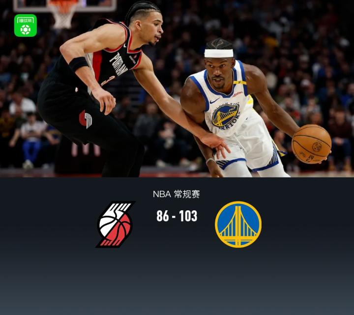 扫描下载懂球帝首页>动态> 勇士103-86轻取开拓者,库里14+5+5,巴特勒24+5+7