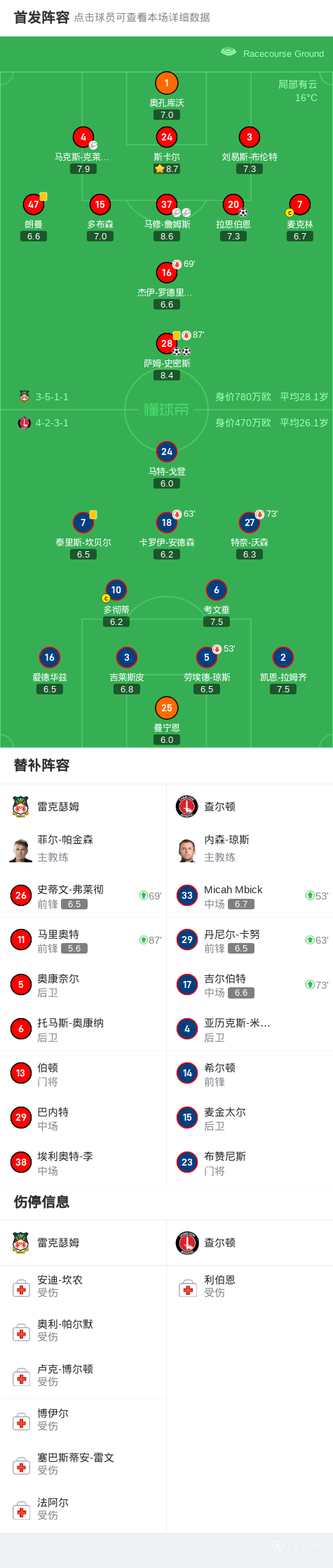 第18分钟,雷克瑟姆球员马修-詹姆斯助攻萨姆-史密斯打入一球。