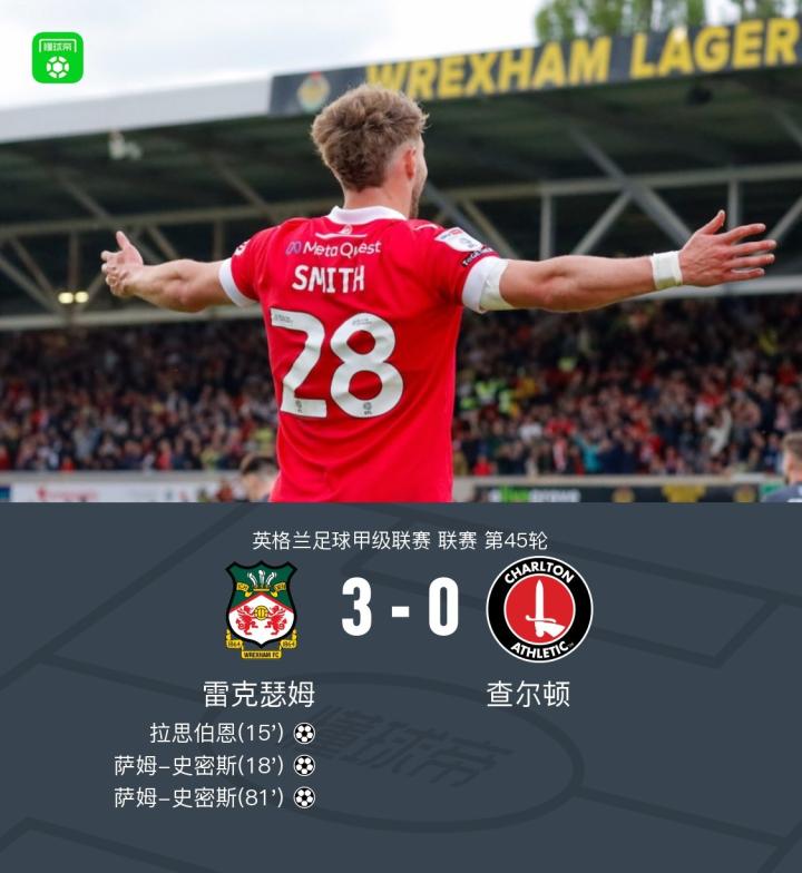 北京时间4月27日,英格兰足球甲级联赛第45轮,雷克瑟姆主场迎战查尔顿。比赛中,雷克瑟姆凭借拉思伯恩的进球以及萨姆-史密斯的梅开二度锁定胜局。最终,雷克瑟姆以3-0战胜查尔顿,领先第三名的斯托克波特郡5分,提前一轮升入下赛季英冠联赛。