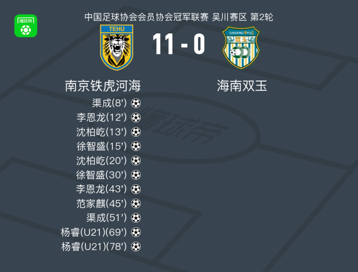 北京时间4月29日,中国足球协会会员协会冠军联赛吴川赛区第2轮,南京铁虎河海主场迎战海南双玉。比赛中,渠成、李恩龙和沈柏屹各自打入两球,徐智盛也有两球进账,范家麒贡献一粒进球,杨睿在比赛后段连入两球锦上添花。最终,南京铁虎河海以11-0大胜海南双玉。