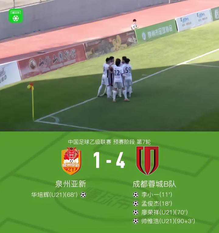 第90+3分钟,刘伯州解围失误,帅惟浩推射破门锁定比分,成都蓉城B队4-1