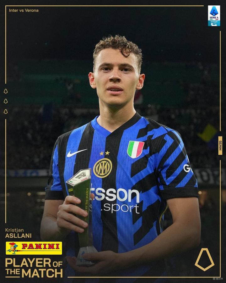官方消息,阿斯拉尼当选国际米兰对阵维罗纳一役全场最佳。