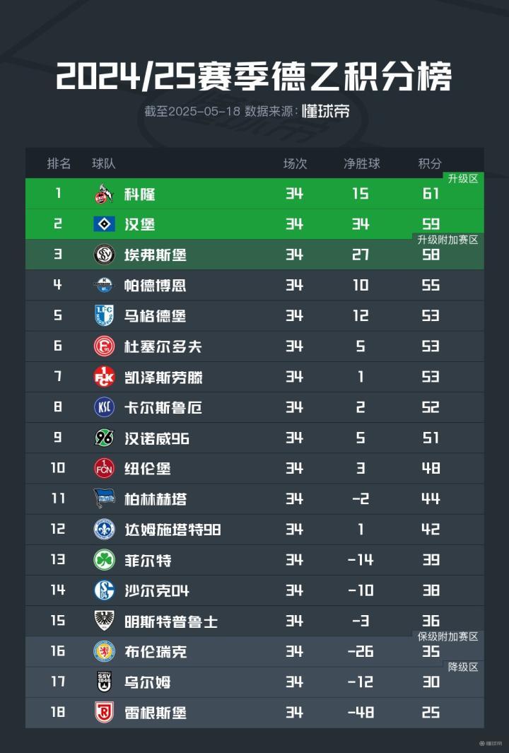 扫描下载懂球帝首页>动态> 德乙大结局:汉堡末轮输球,科隆反超夺冠,两队携手升级德甲