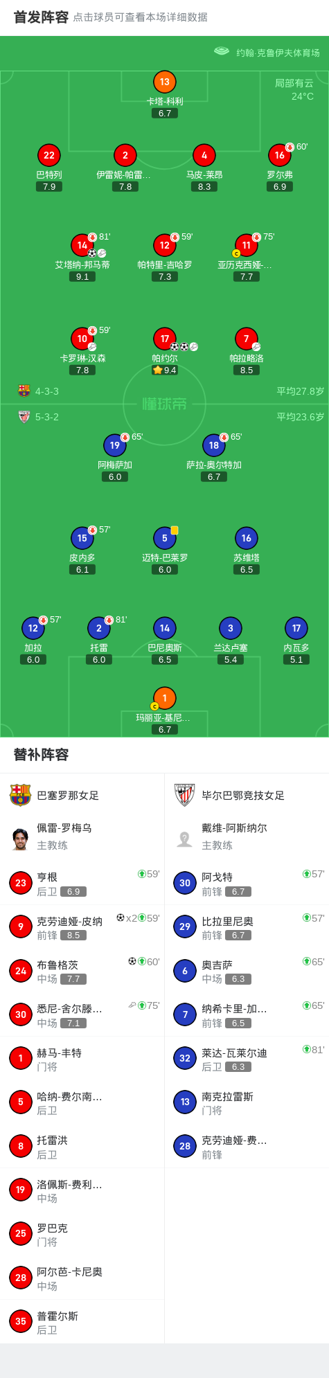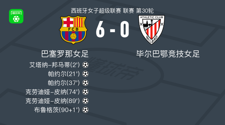 北京时间5月18日,西班牙女子超级联赛第30轮,巴塞罗那女足主场迎战毕尔巴鄂竞技女足。比赛开始后,巴塞罗那女足迅速进入状态,艾塔纳-邦马蒂首开纪录为球队取得领先。随后,帕约尔在比赛中两度建功,将比分优势进一步扩大。克劳迪娅-皮纳在比赛中也有出色表现,完成梅开二度的好戏。临近比赛结束,布鲁格茨锦上添花,再入一球。最终,巴塞罗那女足以6-0战胜毕尔巴鄂竞技女足,全取三分。