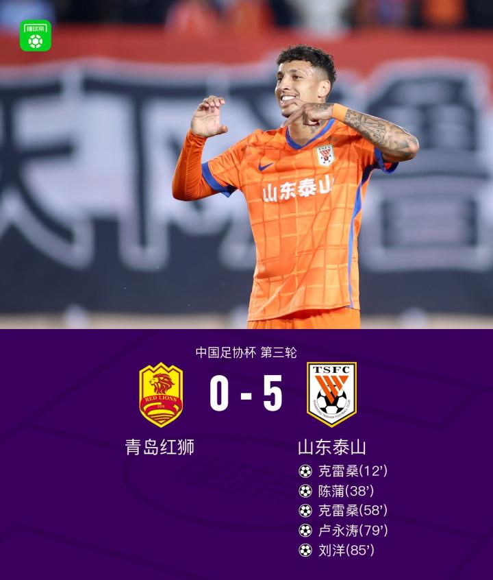 扫描下载懂球帝首页>动态> 足协杯山东5-0青岛红狮晋级,克雷桑双响,陈蒲、刘洋建功
