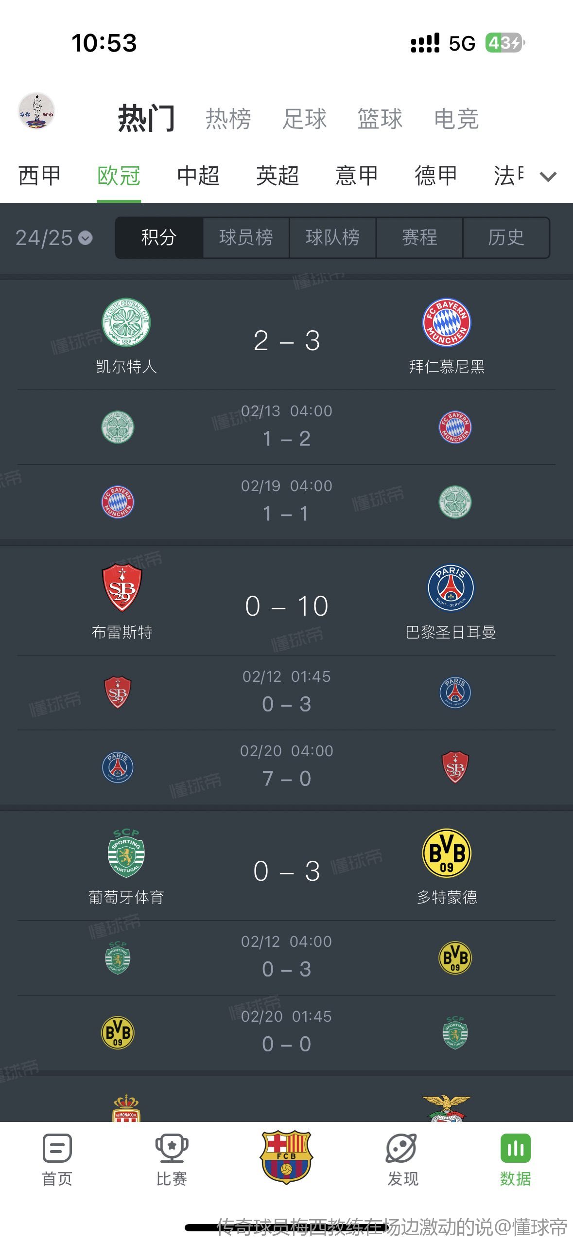 懂球帝首页>动态> 24/25赛季欧冠球队进球榜:巴萨43球居首,巴黎38球第二