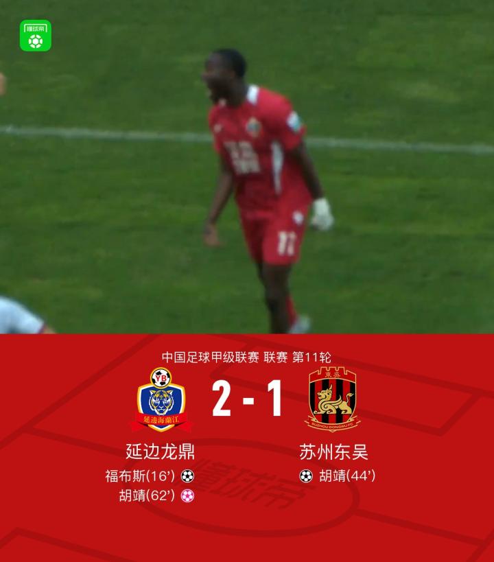 北京时间6月1日,中国足球甲级联赛第11轮,延边龙鼎主场迎战苏州东吴。比赛中,延边龙鼎凭借福布斯的进球取得领先。随后,苏州东吴由胡靖打入一球扳平比分。然而,胡靖在比赛过程中不慎将球送入自家球门,最终延边龙鼎以2-1战胜苏州东吴。