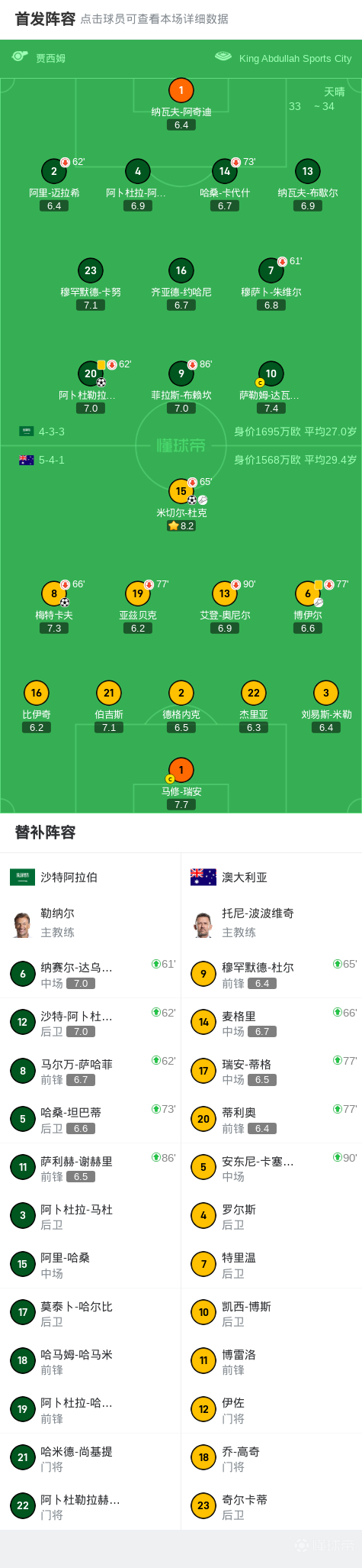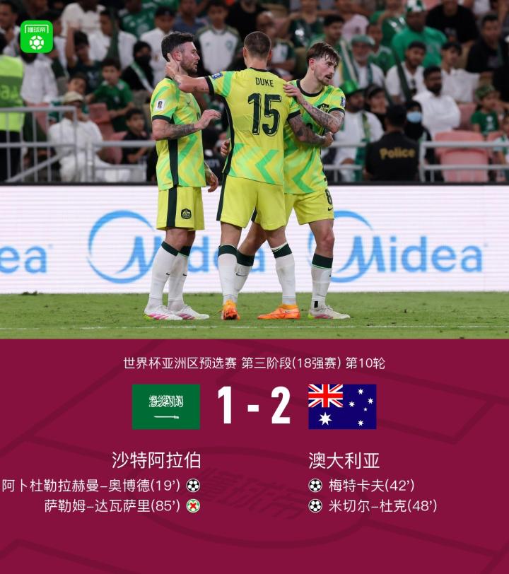 世界杯亚洲区预选赛第三阶段(18强赛)第十轮,沙特阿拉伯与澳大利亚展开较量。上半场,达瓦萨里传门前助攻奥博德抢点破门,杜克助攻梅特卡夫打门得手扳平;下半场,博伊尔定位球助攻杜克反超,达瓦萨里造点后亲自罚点被马修-瑞安神勇扑出。最终,沙特阿拉伯以1-2不敌澳大利亚。
