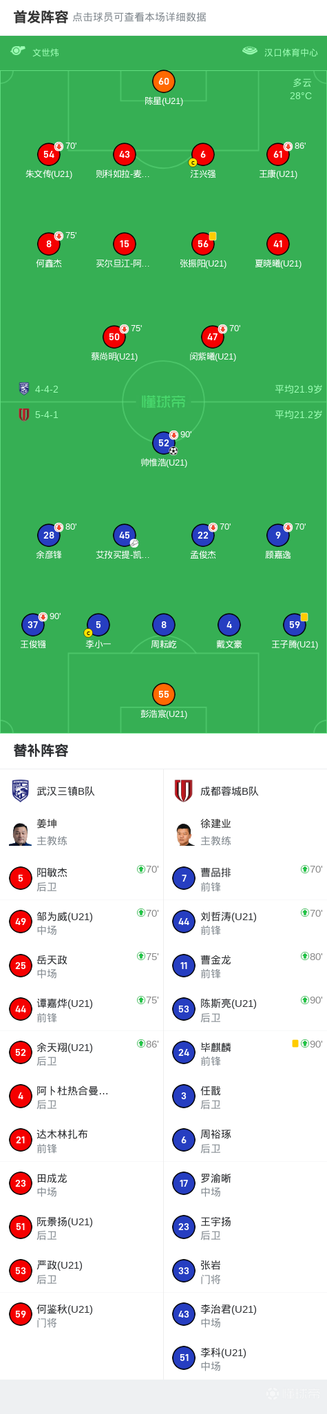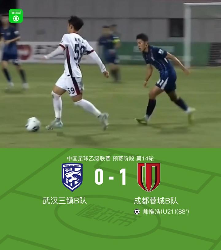 北京时间6月14日,中国足球乙级联赛预赛阶段第14轮,武汉三镇B队主场迎战成都蓉城B队。比赛中,成都蓉城B队凭借帅惟浩的进球取得领先。最终,武汉三镇B队0-1不敌成都蓉城B队。