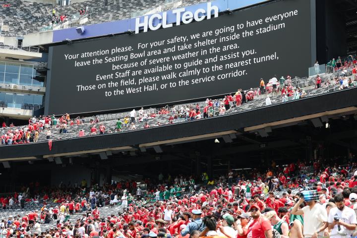 请注意。由于当地出现恶劣天气,为了您的安全,我们将引导所有人离开看台区域,前往体育场内躲避。