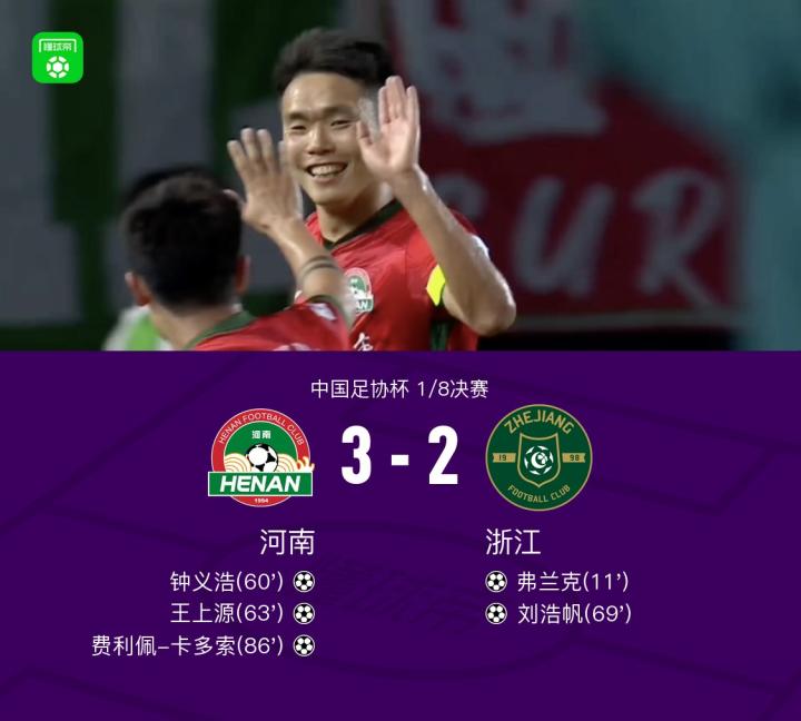 扫描下载懂球帝首页>动态> 河南3-2浙江晋级将战申花,王上源、钟义浩互相传射,卡多索绝杀