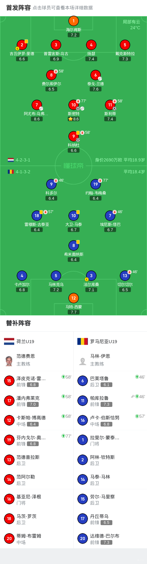 北京时间6月24日,欧洲U19青年锦标赛半决赛展开角逐,荷兰U19迎战罗马尼亚U19。 比赛第36分钟,阿尤布-乌弗基尔送出助攻,科纳杜成功破门,为荷兰队首开纪录。第42分钟,泰戈-兰德助攻斯密特得分,进一步扩大领先优势。下半场第53分钟,斯密特再送助攻,斯利蒂推射建功,将比分改写为3比0。第68分钟,罗马尼亚由帕库拉鲁助攻达维德-巴尔布扳回一球。 最终全场比赛结束,荷兰U19以3比1战胜罗马尼亚U19,成功晋级决赛。