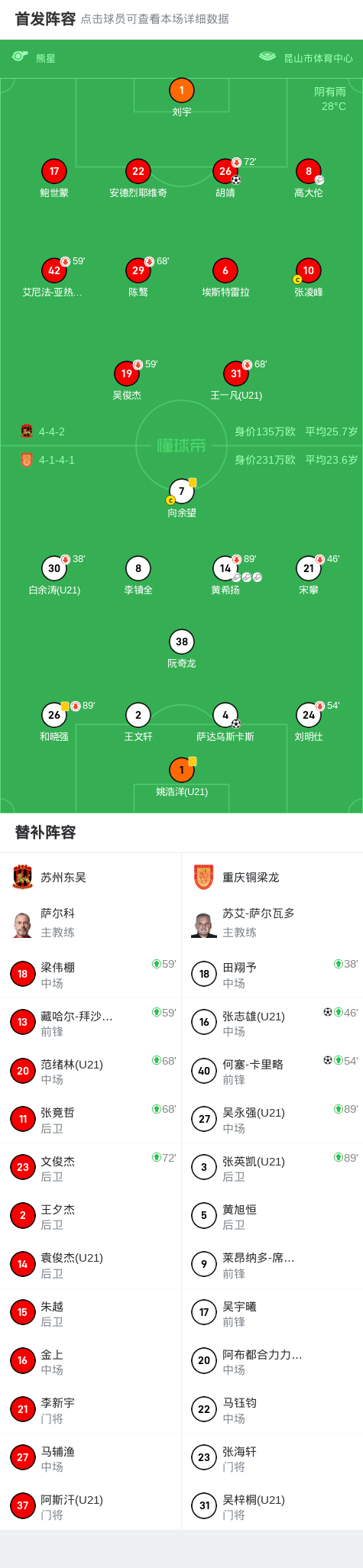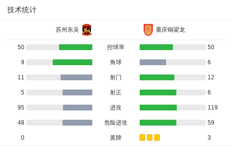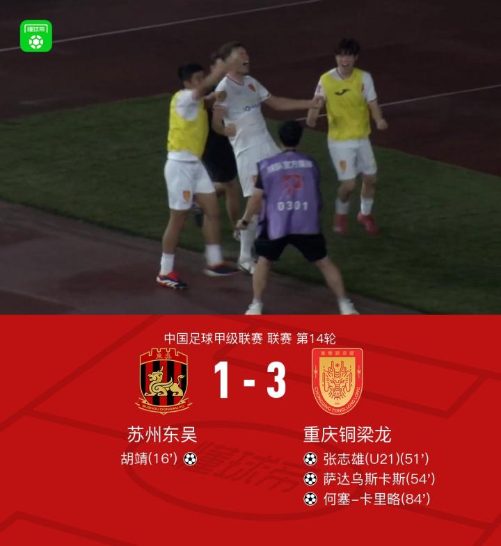 北京时间6月28日中国足球甲级联赛 联赛 第14轮,苏州东吴主场对阵重庆铜梁龙。苏州东吴胡靖破门。重庆铜梁龙张志雄破门,萨达乌斯卡斯破门,何塞-卡里略破门。最终比分苏州东吴 1-3 重庆铜梁龙。