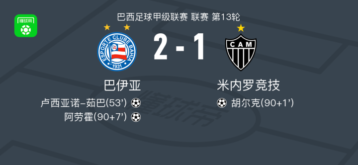 北京时间7月13日巴西足球甲级联赛第13轮,巴伊亚坐镇主场迎战米内罗竞技。比赛中,巴伊亚球员卢西亚诺-茹巴在下半场率先打破僵局,为主队取得领先。米内罗竞技由胡尔克在比赛尾声阶段扳平比分。临近终场前,考利送出助攻,阿劳霍完成绝杀进球,帮助巴伊亚以2-1战胜对手。