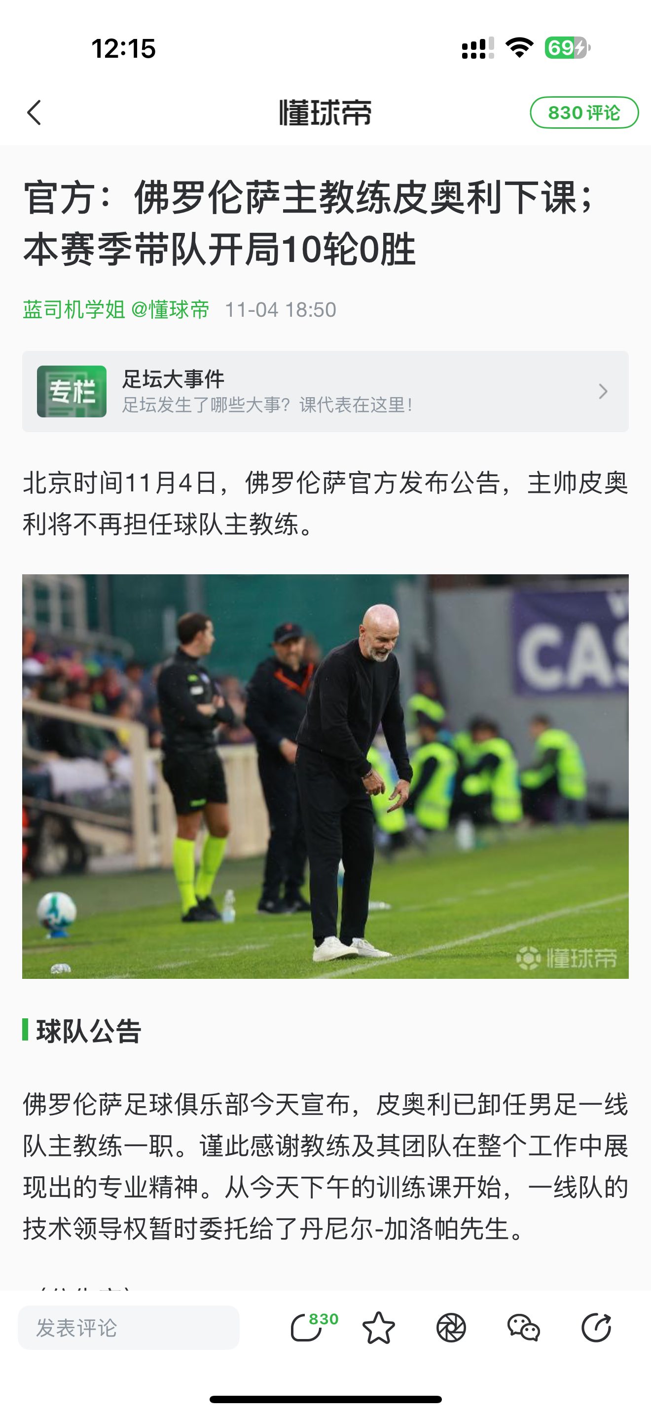 在11月初,热那亚主帅维埃拉因战绩不佳被球队解雇,德罗西接过教鞭。而佛罗伦萨主帅皮奥利也因联赛战绩不佳离开了球队,前都灵主帅瓦诺利上任,德罗西和瓦诺利依旧是意大利国内的老熟人。