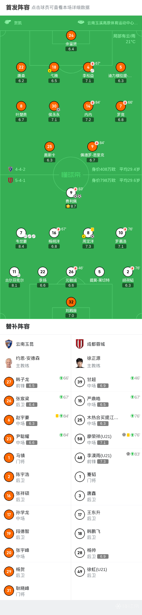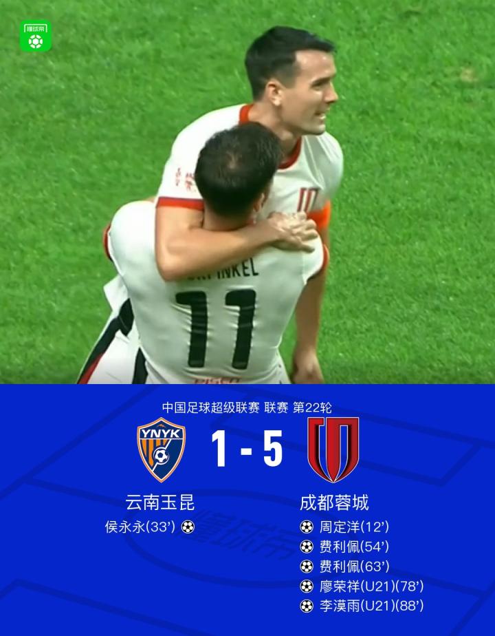 扫描下载懂球帝首页>动态> 成都客场5-1云南,韦世豪三助攻,廖荣祥、李漠雨中超首球