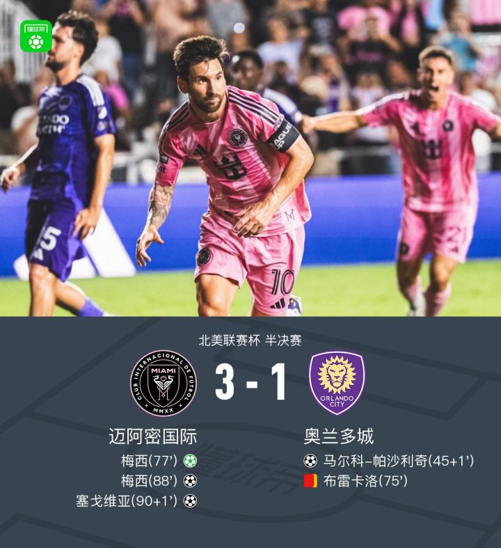 扫描下载懂球帝首页>动态> 迈阿密3-1十人奥兰多城进北美杯决赛,梅西点射+绝杀