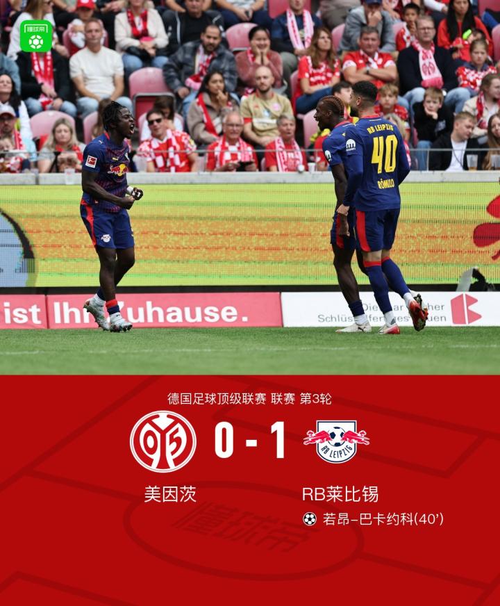 北京时间9月13日德国足球顶级联赛第3轮,美因茨主场迎战RB莱比锡。上半场若昂-巴卡约科内切远射破门,下半场双方均无建树。最终莱比锡1-0客胜美因茨。
