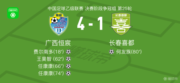 北京时间9月14日中国足球乙级联赛 决赛阶段争冠组 第25轮,广西恒宸主场对阵长春喜都。广西恒宸费尔南多破门,王昊智 破门,任康康梅开二度。长春喜都何友族破门。最终比分广西恒宸 4-1 长春喜都。本场比赛过后,广西恒宸领先第三名17分,提前5轮升入下赛季的中甲联赛。