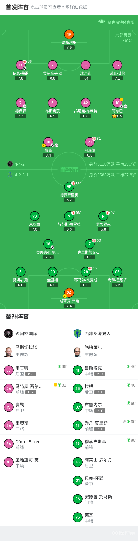 下半场德保罗角球直接助攻伊恩头锤破门,给西雅图都干不会了,门前球都能打偏,随后后防也是没盯住人,让人轻易横传门前进了一个,虽然迈阿密人工草皮干不过西雅图,但西雅图真草皮也敢不过迈阿密
