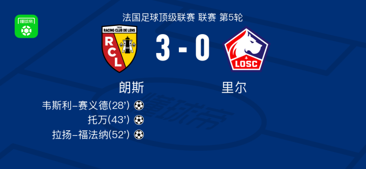 扫描下载懂球帝首页>动态> 朗斯3-0大胜里尔,拉扬-福法纳破门,托万建功