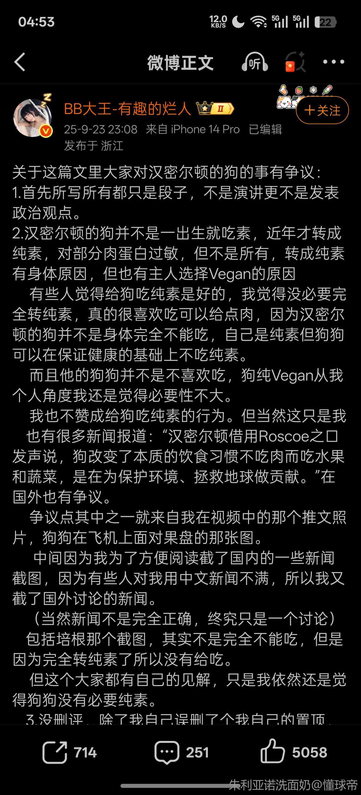 然后关于那个脱口秀博主——BB大王,我只能说她都靠脱口秀吃饭了,那还指望她怎么保持严谨?微博发的回复也在狡辩自己污蔑别人的话当成段子说,直接把老汉营造成了一个虐狗的“爱狗人士”,而且微博还锁评论区,抖音 B 站装死一点正面回应都没有。下次遇到被别人造黄谣的时候希望她也觉得是段子吧