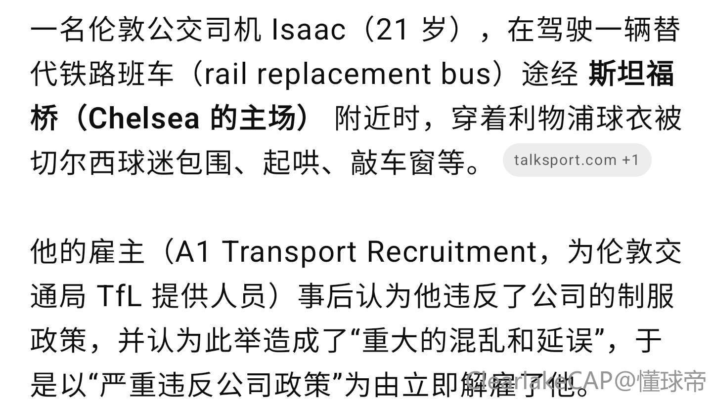 中立的猜一下被解雇的可能性,不知道英国公共交通是不是需要统一着装,类似于中国地铁或者公交车的工服,我个人理解大概率是有的。如果说有的话,这个小哥可能是因为没有穿工服导致被处罚,毕竟在中国穿便装的话我是没见过。另外这个小哥看起来在🚗出发的时候(自拍看起来没人)就进行了自拍,感觉是直到今天比赛时间自己会经过斯坦福桥。可能也是希望自己喜欢的球队赢球,这时候发个ins之类的,但是遇到了素质低的足球流氓,导致事态扩大。